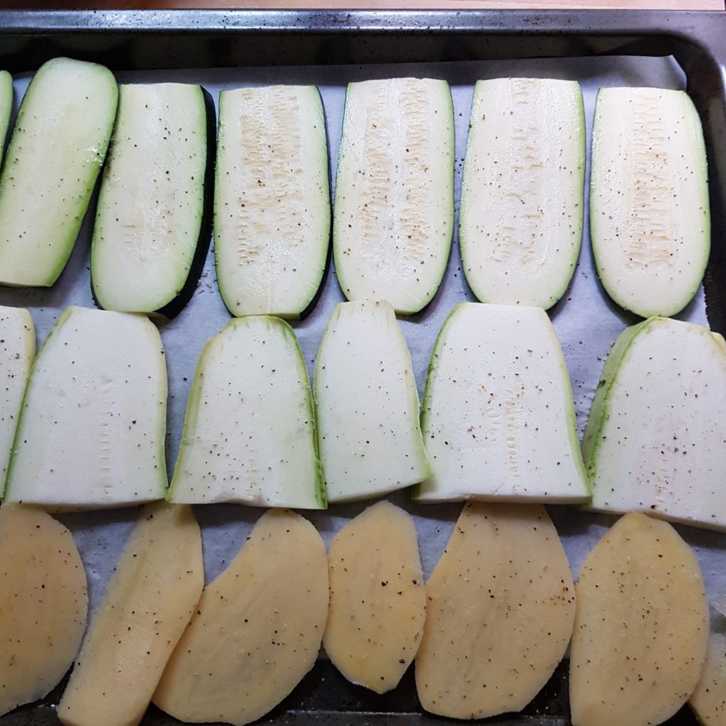 - Laver les courgettes et pomme de terre. Les couper dans le sens de la longueur (1/2 cm environ d’épaisseur). Couper les courgettes en 2.